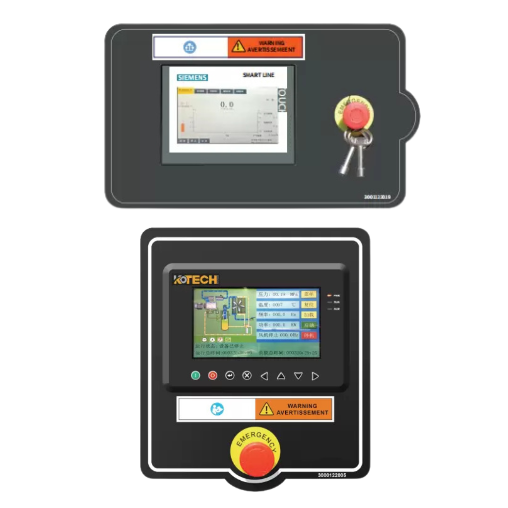 El controlador de la serie KOE combina conversión de frecuencia y potencia con la capacidad de cambiar entre distintos modos de operación. Este avanzado sistema permite la detección de temperatura de escape y el ajuste automático PID para equilibrar la presión y controlar la carga. También incluye protección contra falta de fase, desequilibrio y sobrecarga del motor principal, así como detección de secuencia de fases para prevenir el giro inverso.